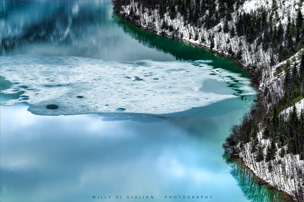 Mi colpivano le forme geometriche della riva innevata con il blu intenso dell'acqua.