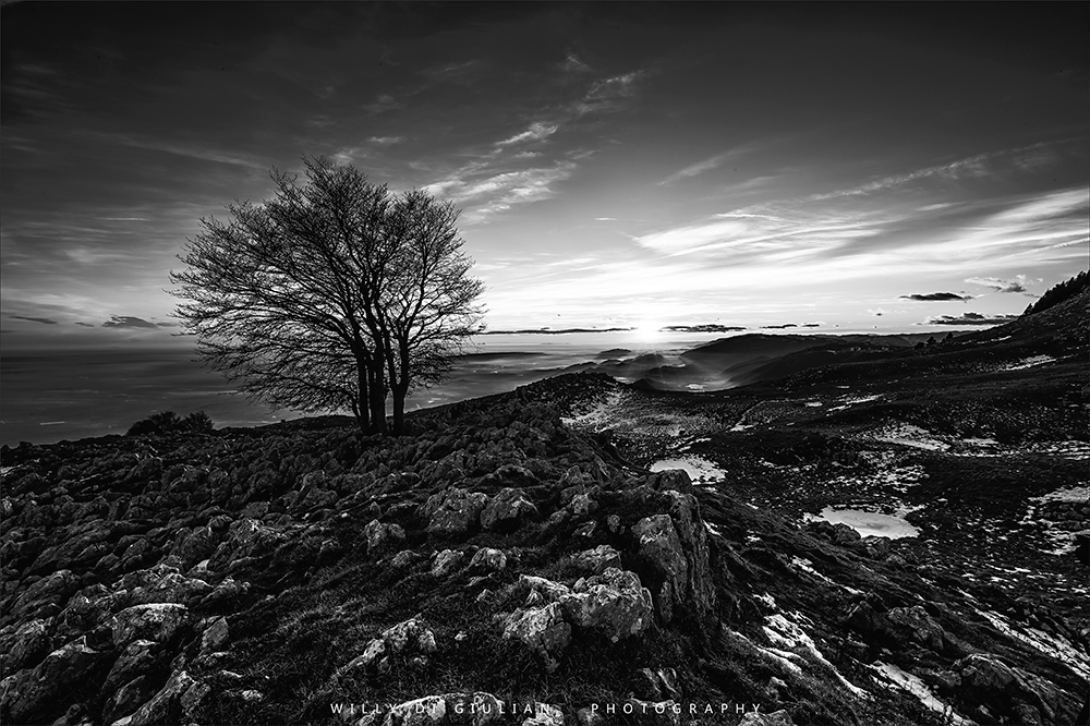 I grafismi delle rocce in primo piano, l' albero in netto controluce e lontano il sole che scende, mi ha ispirato per fare un bianco e nero tagliente forse cupo.